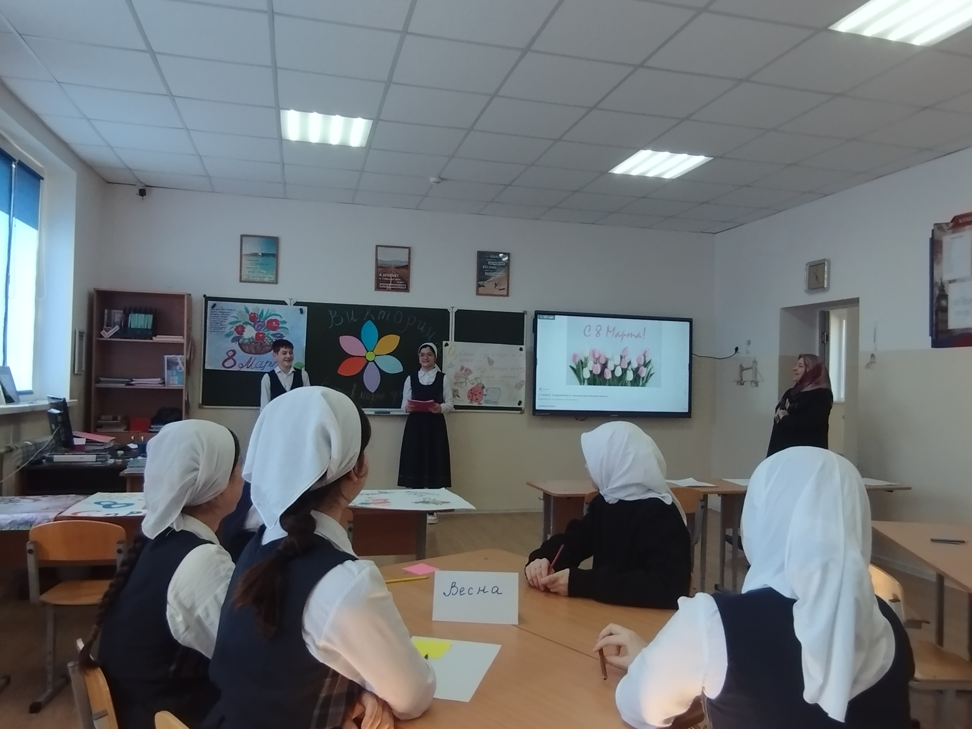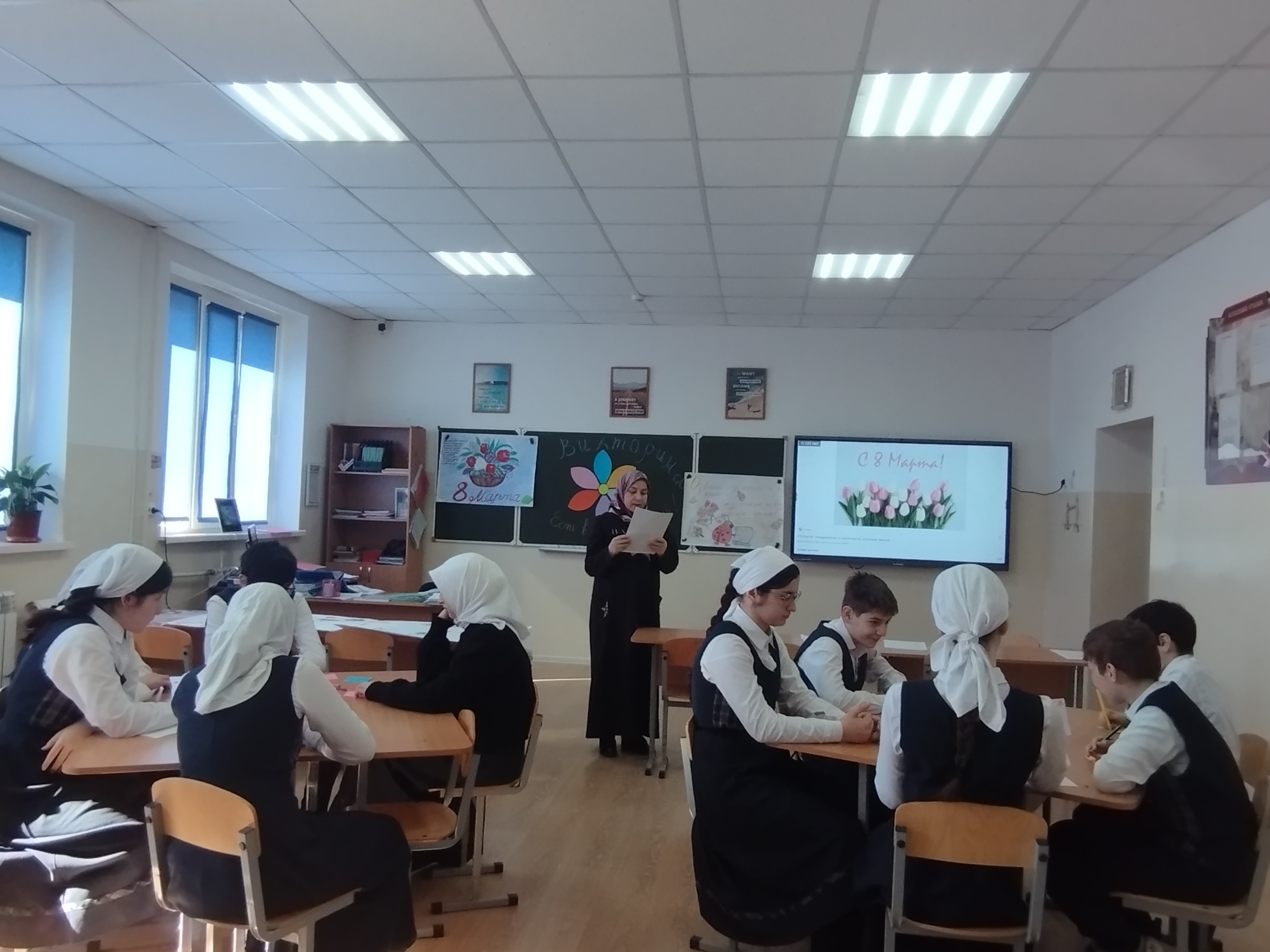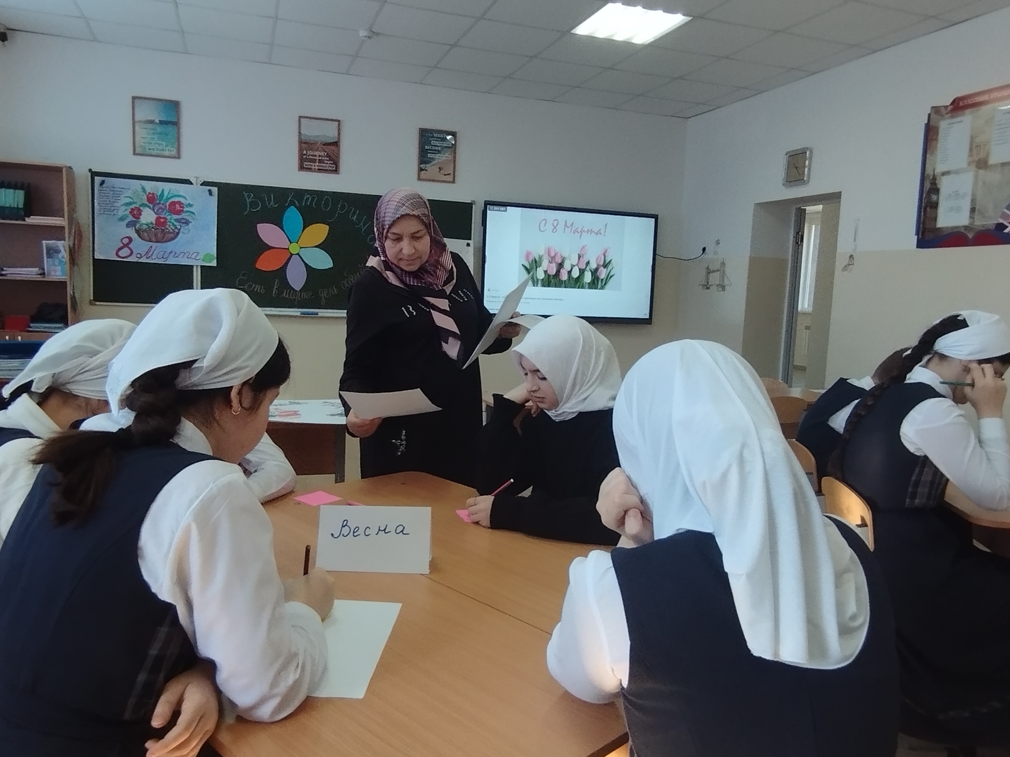 Классный руководитель 7 класса Сайдаева Эсила Адуваевна провела со своими подопечными интеллектуальную викторину «Есть в марте день особый!». В ходе мероприятия команды состязались в нескольких тематических раундах: «История праздника»: вопросы о происхождении даты и борьбе женщин за свои права. «Цветочный калейдоскоп»: конкурс на знание весенних первоцветов, таких как ландыш, тюльпан и орхидея. «Женские образы в литературе»: раунд, посвященный знаменитым героиням классических произведений. «Творческий экспромт»: конкурс поздравлений в стихах и прозе.