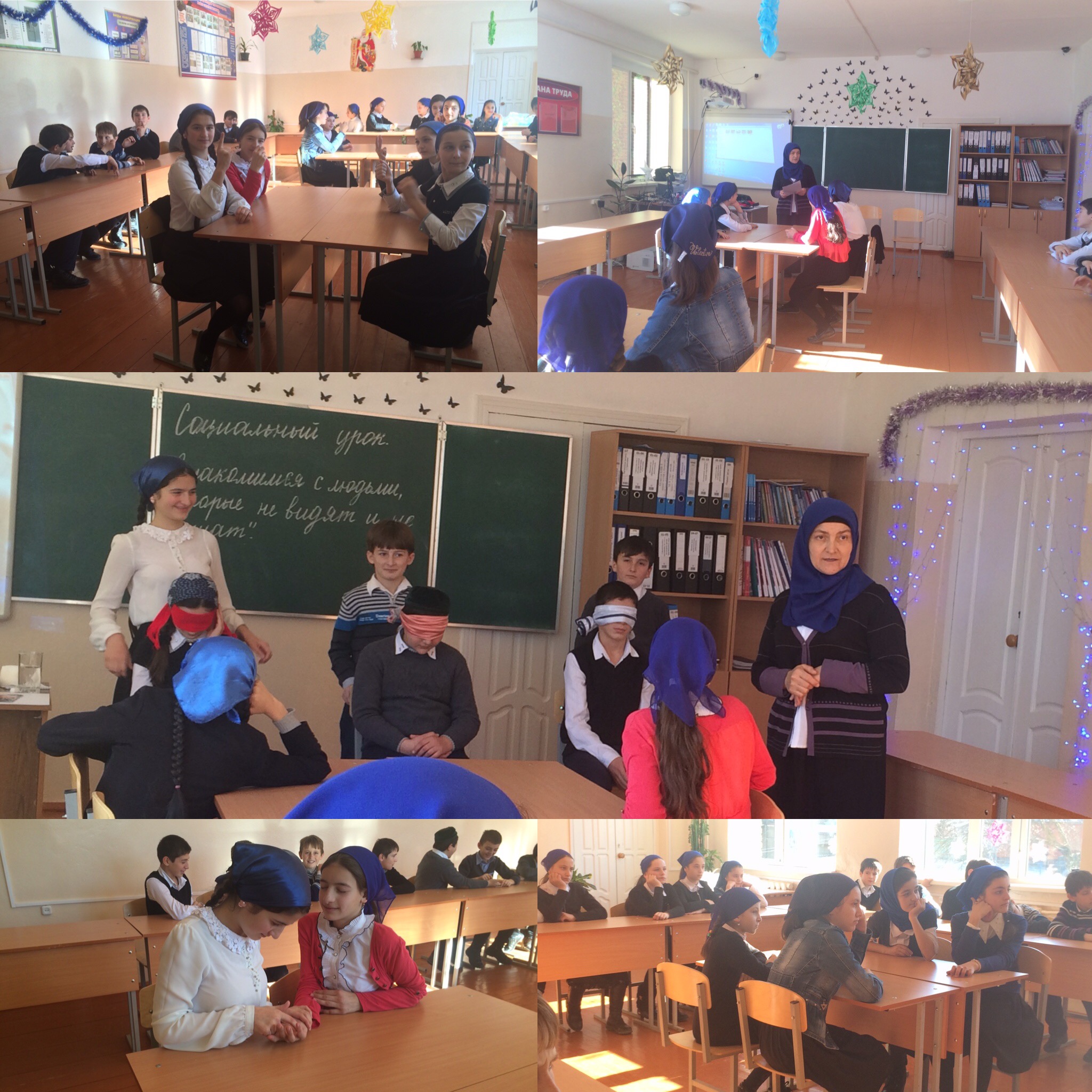 В ходе урока учащиеся просмотрели видеоролики «Слово на ладони» фрагмент), «Мир слепоглухих», «Один в темноте», видеообращение заместителя министра образования Каганова В. Ш. Учащиеся участвовали в ролевой игре «Помоги ближнему». Они поили водой, своих одноклассников, у которых были закрыты глаза, завязывали им шнурки, застегивали пуговицы и т.д. В конце урока учащиеся делились своими впечатлениями от просмотренных роликов и участия в игре.