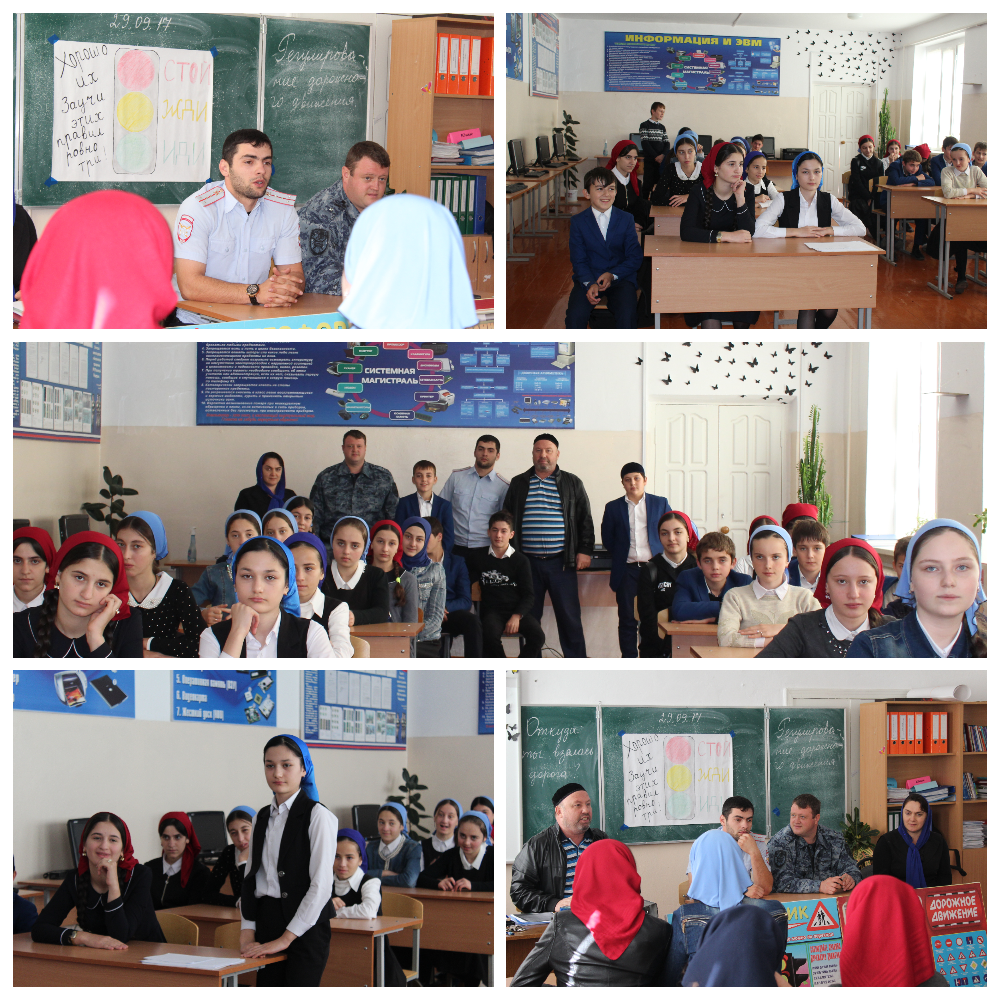 29.09.2017В школе состоялась беседа с учащимися 5-8 классах с привлечением сотрудников ГИБДД в частности с начальником ГАИ ОВД России по Шатойскому району капитаном полиции Ахмадовым Мамиханом Б. и специалистом ОГО ВОГО и П майором полиции Осадчий А.М. В своем выступлении они отметили, что одним из важнейших направлений деятельности образовательного учреждения по профилактике ДДТТ считается работа с родителями, поскольку основным способом формирования у детей навыков проведения является наблюдение, подражание взрослым и, прежде всего, своим родителям.